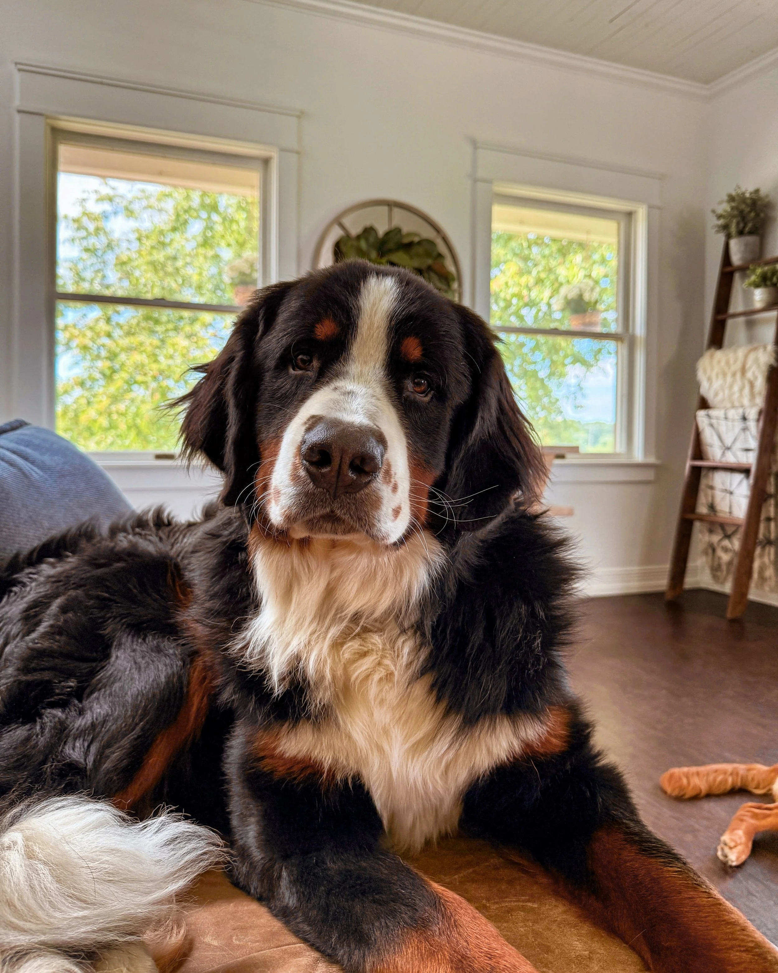 Our sweet and beautiful Kimber girl. Her tail is always wagging and she so happily sits in front of us with her soulful eyes to tell us how much she loves us. She gets the zoomies every time we let her out in our yard and we love watching her run laps around our chicken coop. She is so kind, so sweet and so stunning. It feels like she was always meant to be ours. We love our Berner girl so much!